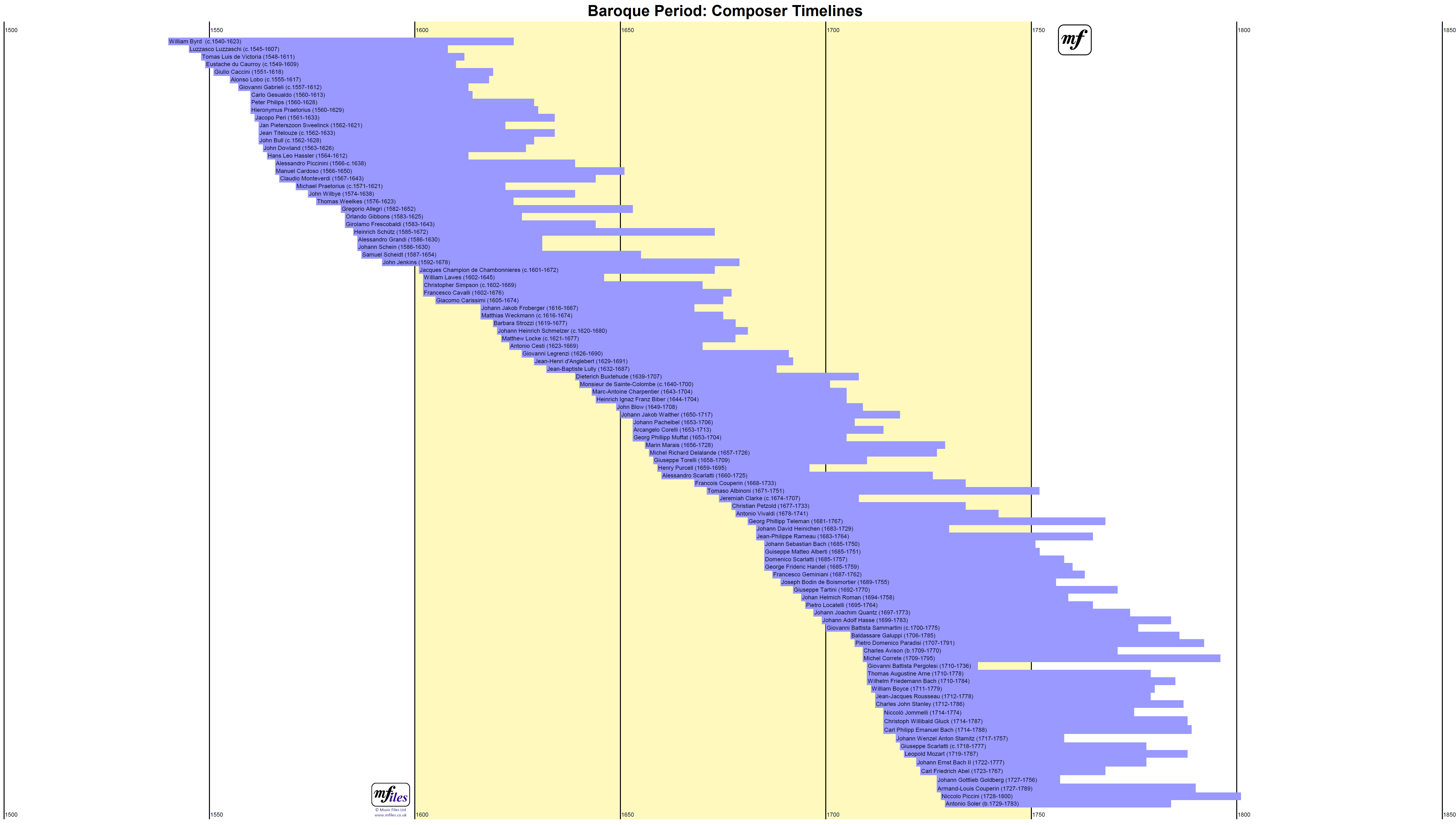 The above diagram is a composer timeline for the Baroque Period, approx. 1600-1750. Click on the image to enlarge in a separate window.