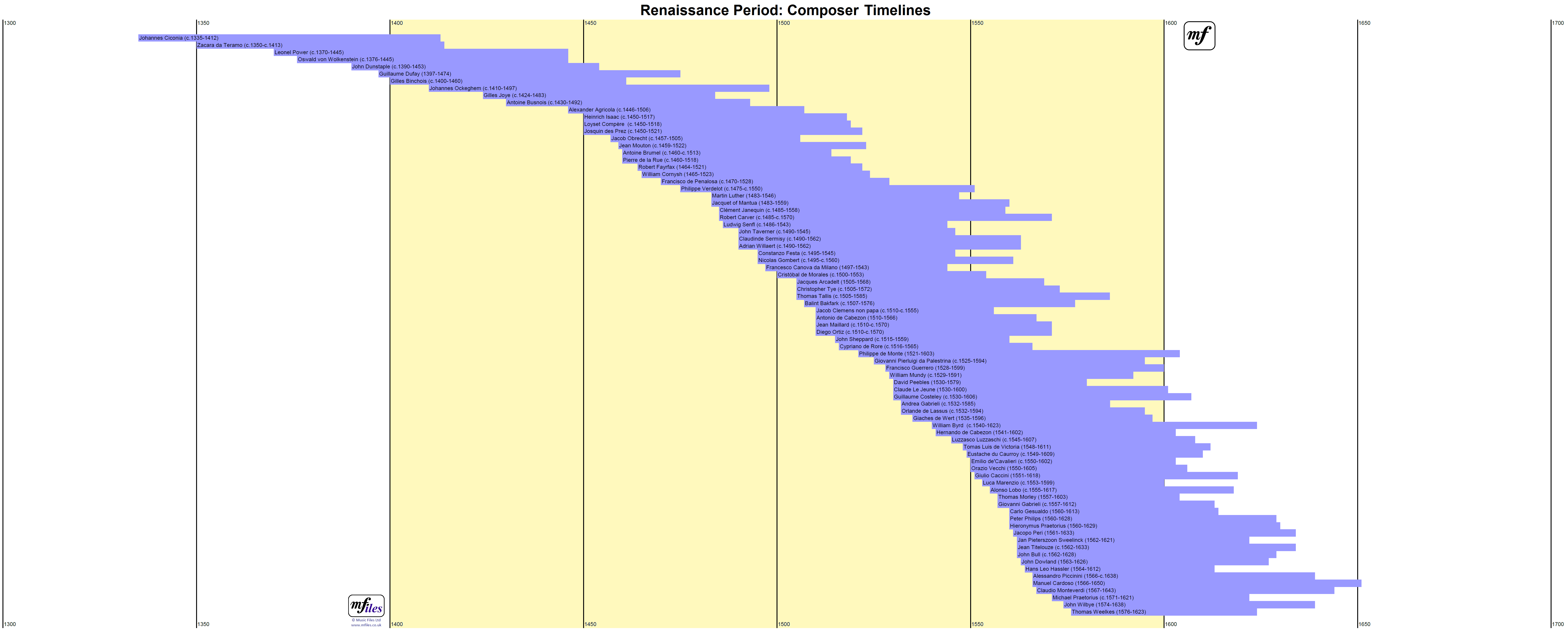 The above diagram is a composer timeline for the Renaissance Period, approx. 1400-1600. Click on the image to enlarge in a separate window.