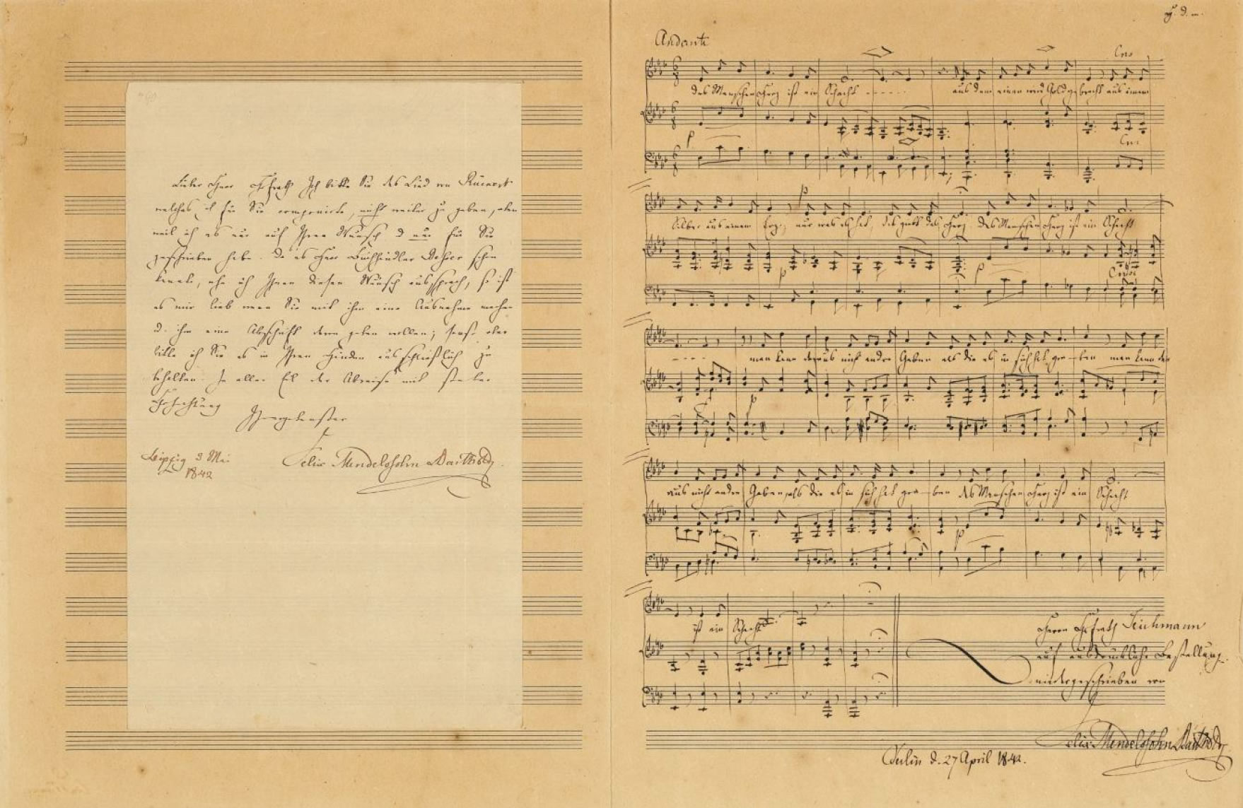 Effectively a Renaissance Man of his time, Mendelssohn excelled in virtually any undertaking, musical or otherwise. Like some other composers he was a voluminous letter writer, and his missives are somewhat more readily available and affordable to collectors than those of, say, Brahms or Beethoven, whose letters today can command a small fortune at auction. Like Robert Schumann's, even Mendelssohn's most mundane letters can be small literary gems. Like Bela Bartok's later on, his musical note-hand was remarkably neat and clean, and even today a musician could easily play from the holograph manuscripts themselves.