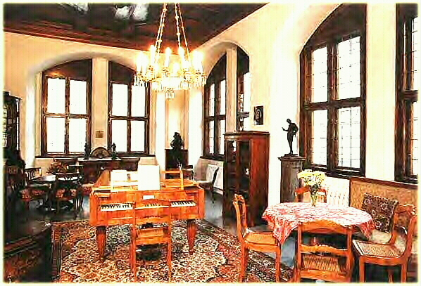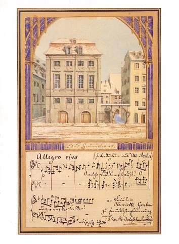 Two years later he was made conductor of the Gewandhaus Orchestra in Leipzig. Under his direction the ensemble soon became the most distinguished orchestra in Germany. The conductor's podium, replete with its taper-sticks (i.e., candle-holders), was one of the few articles saved from the old Gewandhaus concert hall before it was demolished and replaced with a new building (which, in turn, was destroyed during the second world war). That very rostrum, from which Mendelssohn and later Liszt, Wagner, Brahms and others had conducted, was for years displayed in Leipzig's Old City Hall -- as is the very table at which Bach himself sat when he signed his contract with the authorities to become the organist at the Thomaskirche. Also on view at the Old City Hall is Mendelssohn's Johann Baum piano, exhibited in an area depicting the composer's living room, recreated with the original furniture rescued from his Leipzig residence.