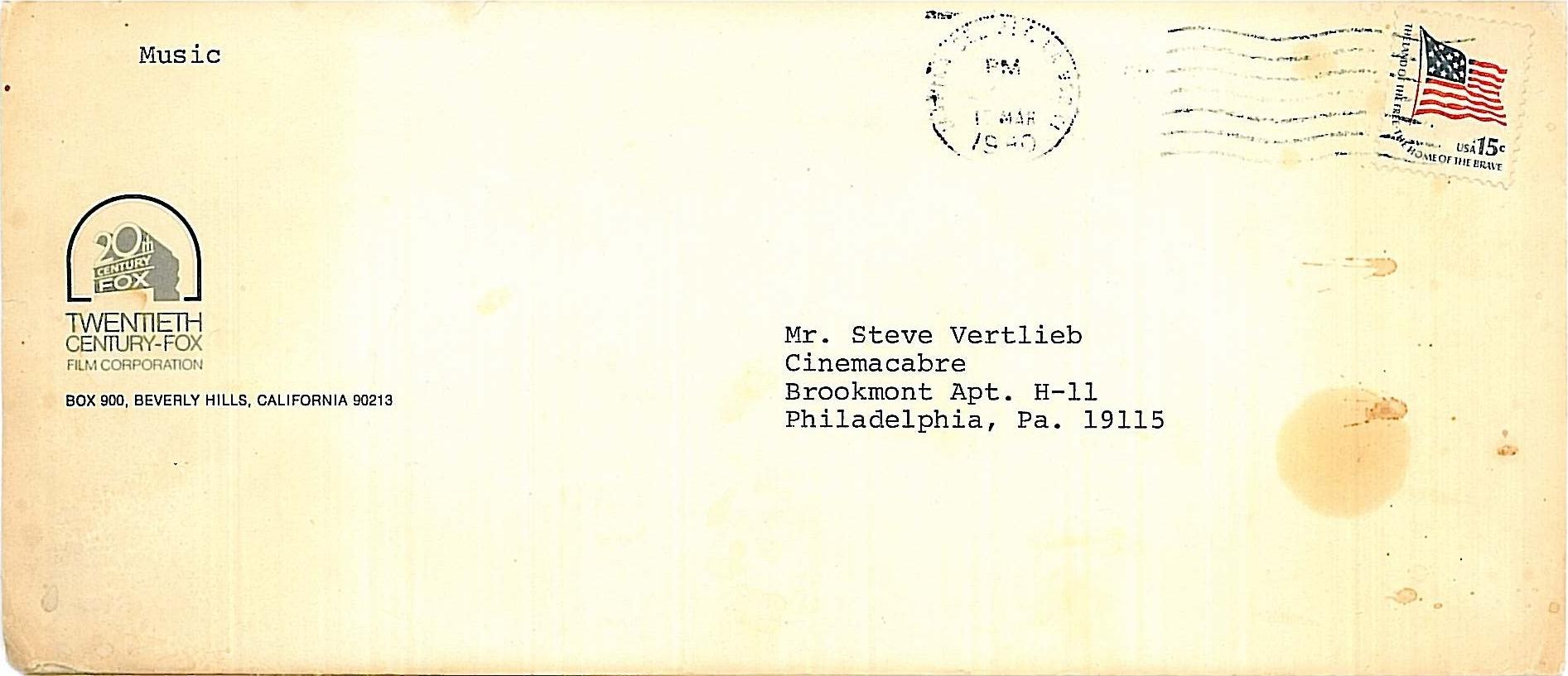 The envelope from Jerry Goldsmith's letter to Steve Vertlieb.