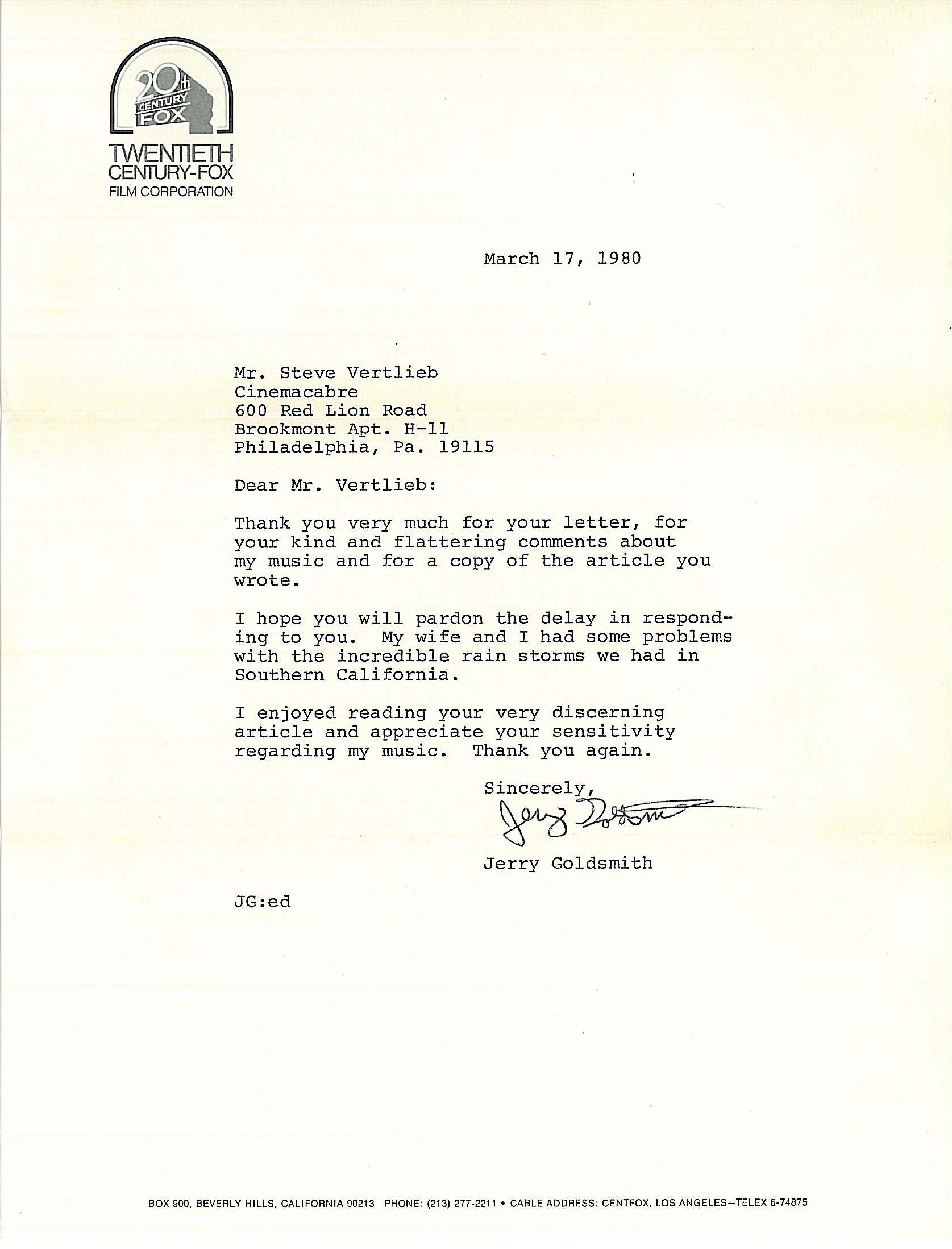 Jerry Goldsmith's letter to Steve Vertlieb.