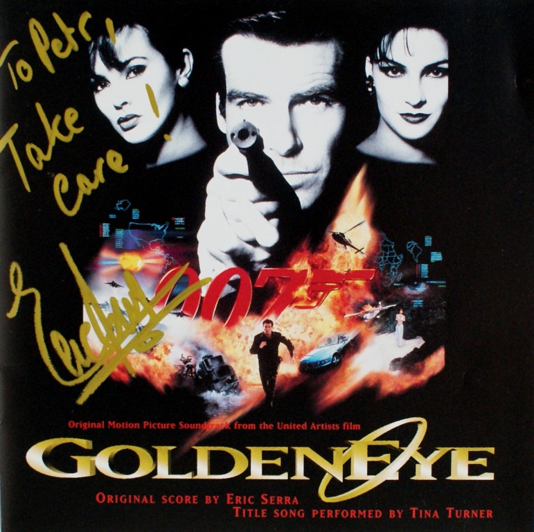 Eric Serra: Goldeneye soundtrack CD cover GoldenEye (Bond no.17) was the first film to feature Pierce Brosnan in the title role, and the producers were keen to take the opportunity to modernise the film franchise once more. For the music they chose composer Eric Serra who had scored a few distinctive French films. His previous film music had included a number of song tracks and some electronic elements, and the filmmakers were no doubt hoping that these skills would help to modernise Bond's music. The title song was written by Bono and The Edge and well delivered by Tina Turner whose vocals resemble those of Shirley Bassey at times. Although there are romantic moments with strings and some recurring themes, Serra's score uses a lot of electronic effects. Sometimes this worked well with the film giving an eerie atmosphere, and he created an unusual percussive version of the Bond Theme. However for many fans this was too much of a departure from the Bond Sound, with very little of the customary orchestral brass. The producers must have realised the music wasn't working well, since for the famous Tank Sequence they brought in composer John Altman to create a replacement cue. This is mentioned in part 8 of the James Bond's Greatest Hits documentary.