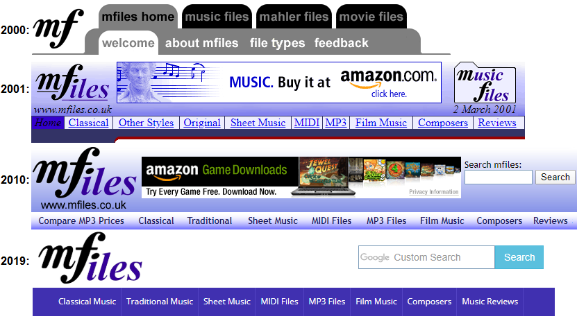 Beethoven's is not the only anniversary in 2020, since it also marks the 20th anniversary of the mfiles website. The image below shows 4 different styles of the top navigation menu as it has evolved over the years: