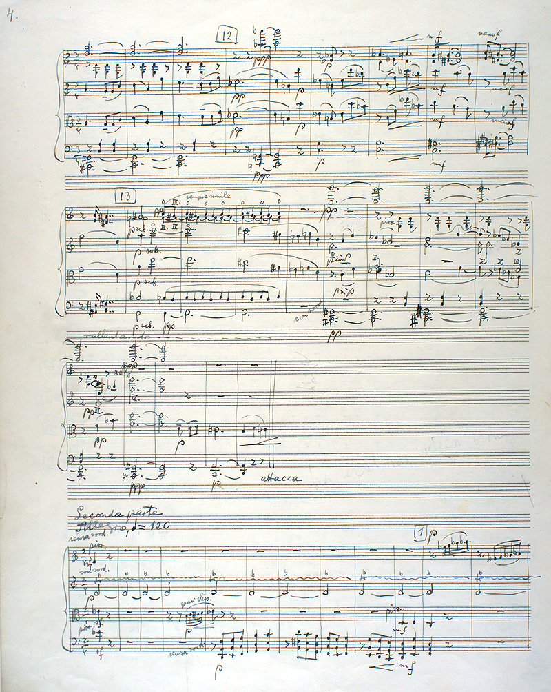 Visually, the original musical manuscript in the composer's own notehand that we call an autograph score can assume almost a life of its own. It has more "life" than a printed or engraved edition, for reasons very obvious: it's literally a graphic picture of what the composer wrote and is therefore unsullied by editorial liberties or, usually, errors. An autograph score is usually the best source, and is always particularly useful, for establishing an authentic text of a printed edition of the work in question -- certainly as the composer intended it at the time of its completion. A composer's own changes or revisions in the autograph score can also provide insights into the compositional process, the development of a composer's style, and may even indicate how he wanted his music performed. They can also shed light on the order in which the same composer penned different works.
