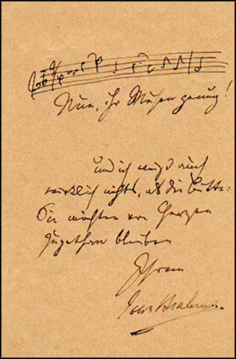 When Verdi saw the original manuscript of Beethoven's Third Symphony, the "Eroica" (now at the Gesellschaft der Musikfreunde in Vienna), he reverently removed his hat. Robert Schumann wore his heart on his musical sleeve, for all to hear. Johannes Brahms, more the introvert, concealed his emotions behind a veil, aiming his musical riches at those who sought them -- but it's said he kept on his own desk some writing-sand from the inkstand used by Schubert, whose music Brahms held in very high regard.