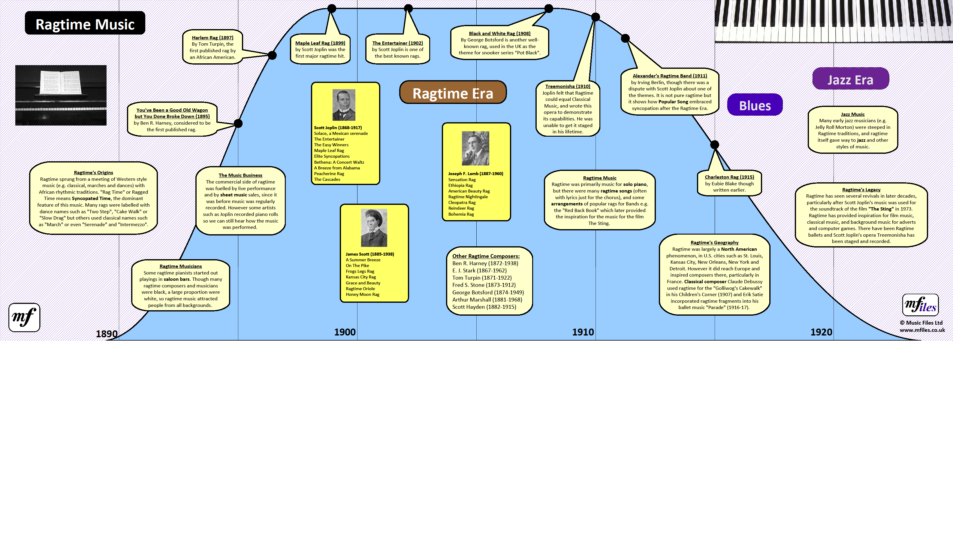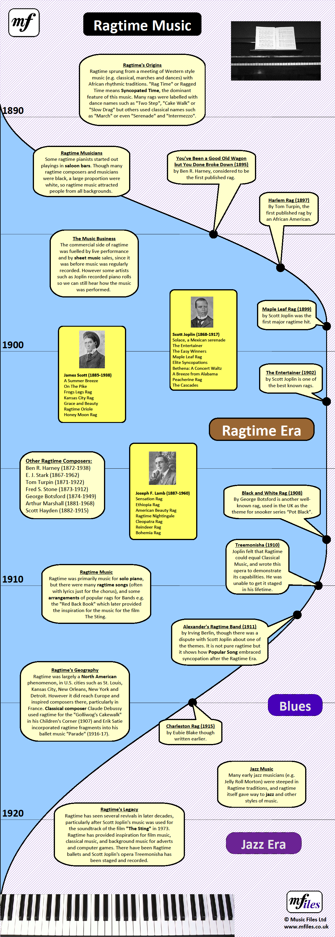 An infographic is available which illustrates the Ragtime Era, showing major events on a timeline and summarising the main features of ragtime music and its key composers. The infographic is available in two formats: horizontal and vertical, and below is a small version of the horizontal infographic. Click the image to view a larger version in a separate window or tab, or here is the Ragtime Era Vertical Infographic. Both can be printed like a poster to put on a wall.